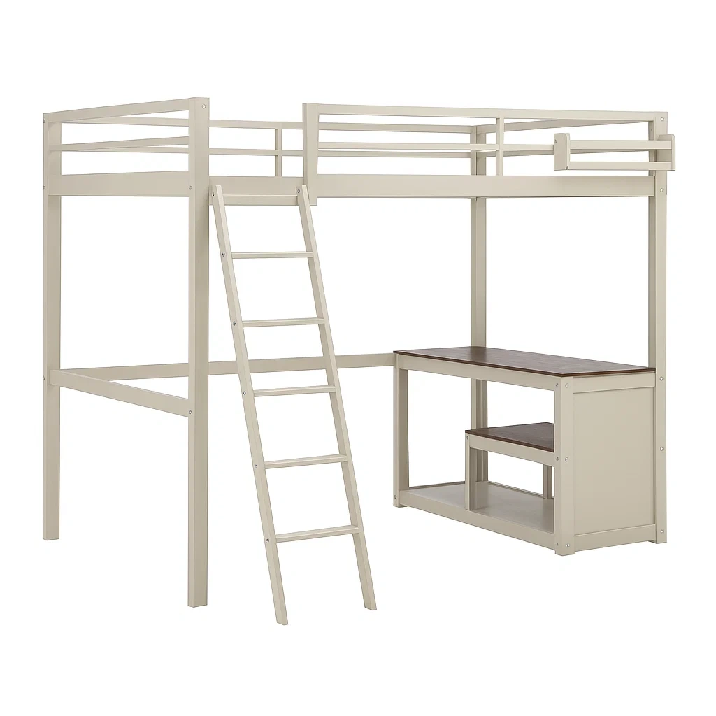 Lit mezzanine en métal avec bureau intégré et échelle beige