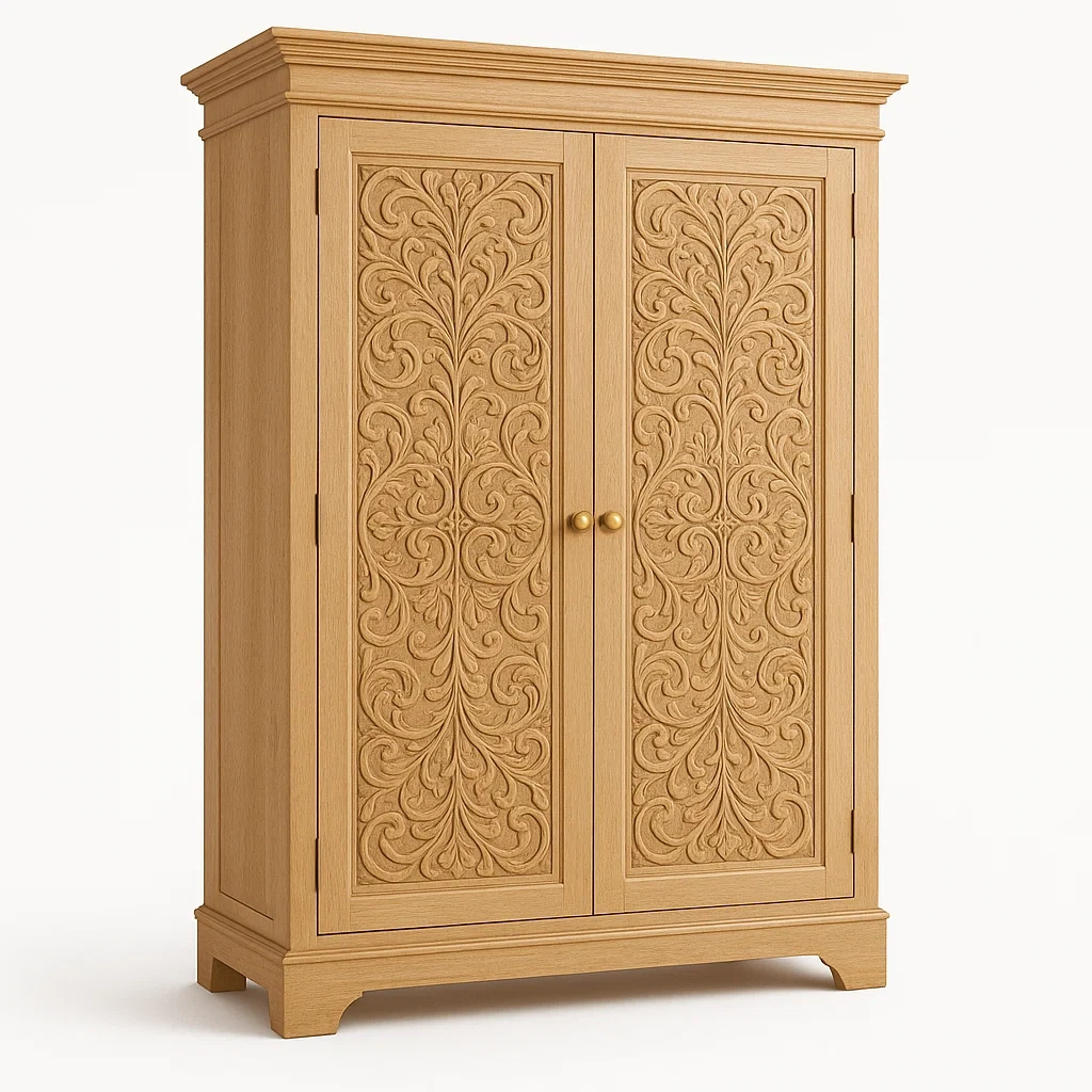 Matériaux : Bois massif avec motifs sculptés sur les portes.