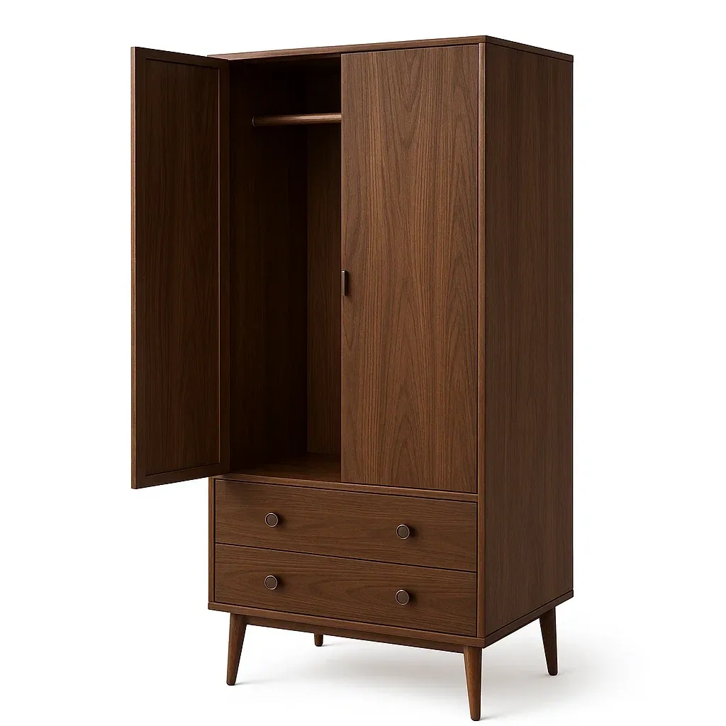 Cette armoire est équipée de deux portes et de deux tiroirs, offrant plusieurs options de rangement pour vos vêtements.