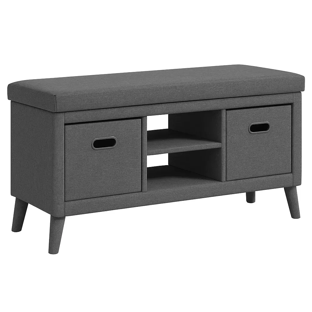 Banc de rangement avec deux casiers amovibles et une étagère centrale.