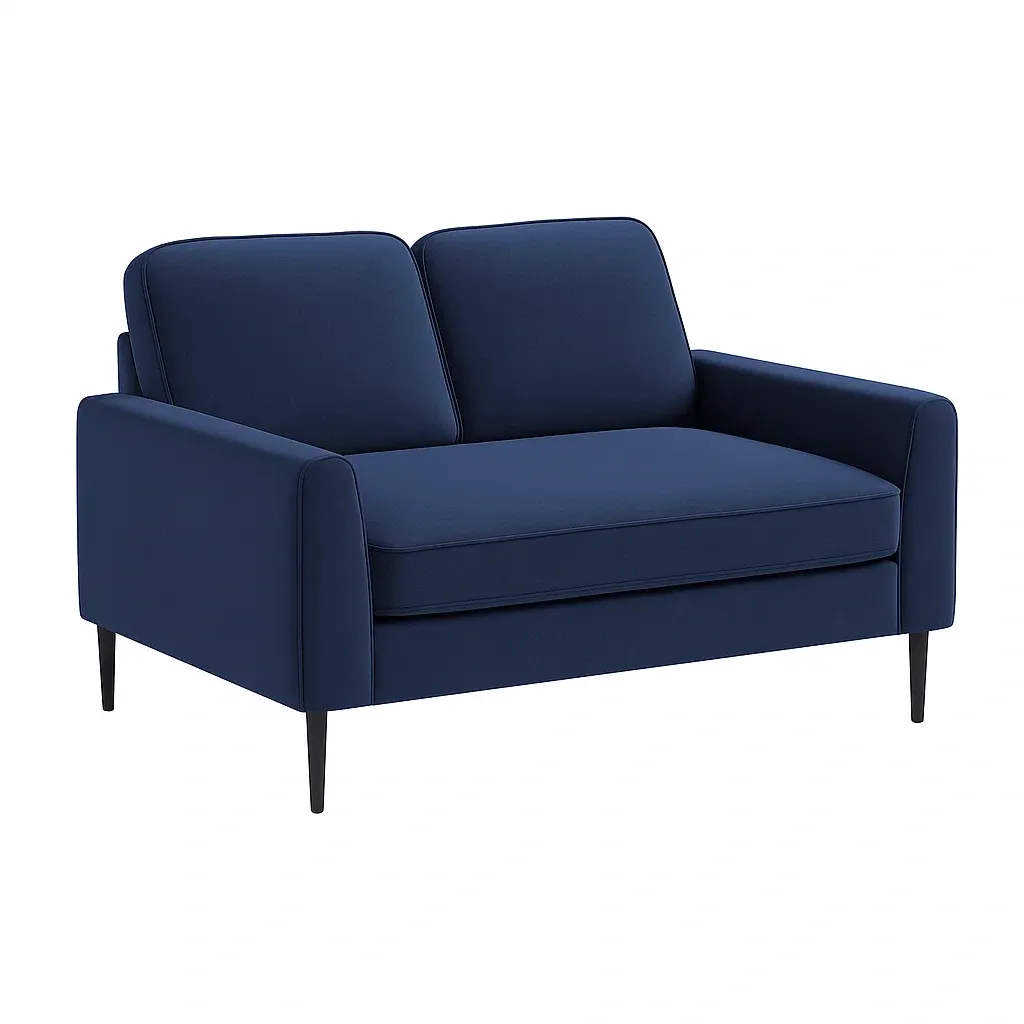 Ce canapé deux places est recouvert de tissu en polyester bleu.