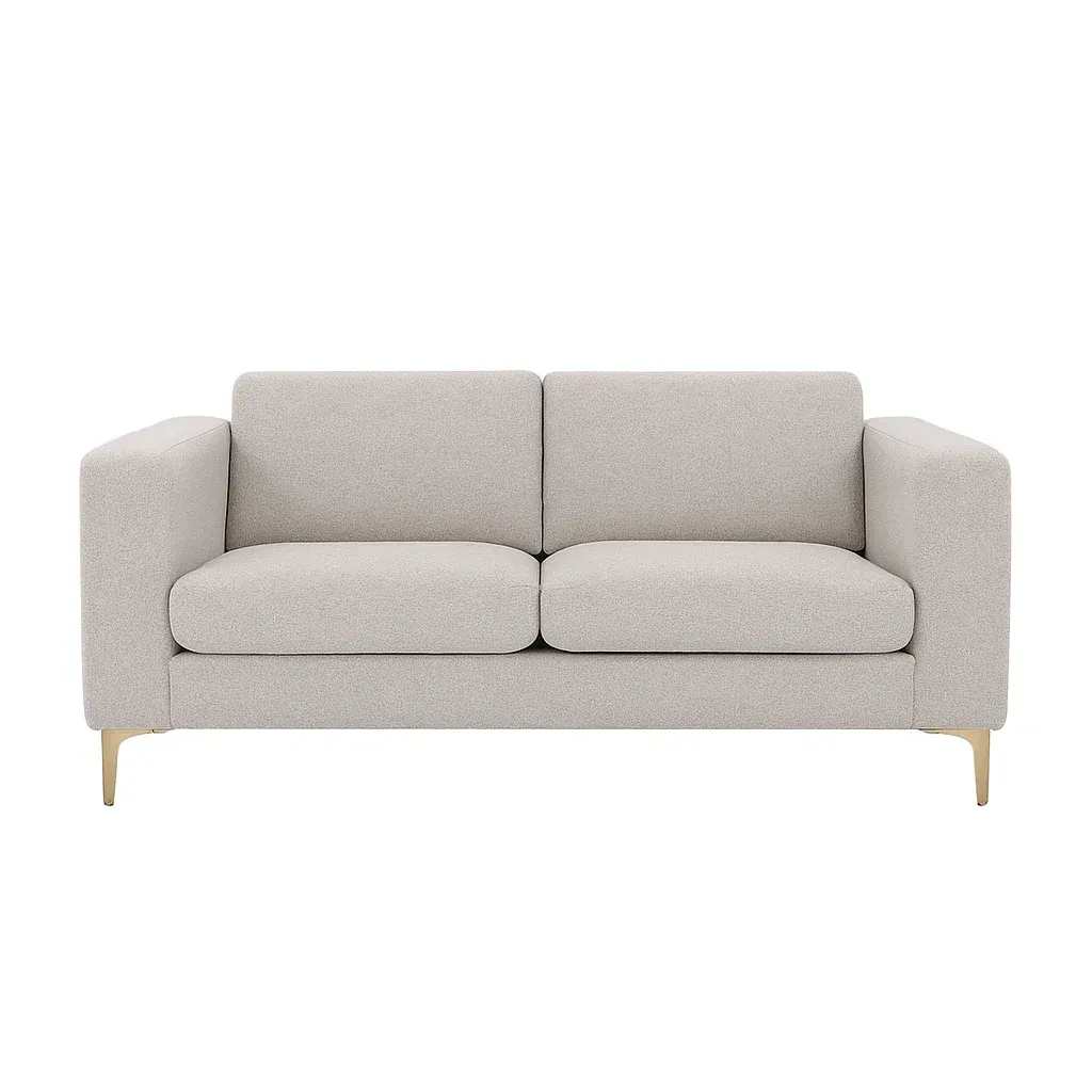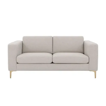 Le canapé 3 places est conçu avec un tissu en polyester beige.