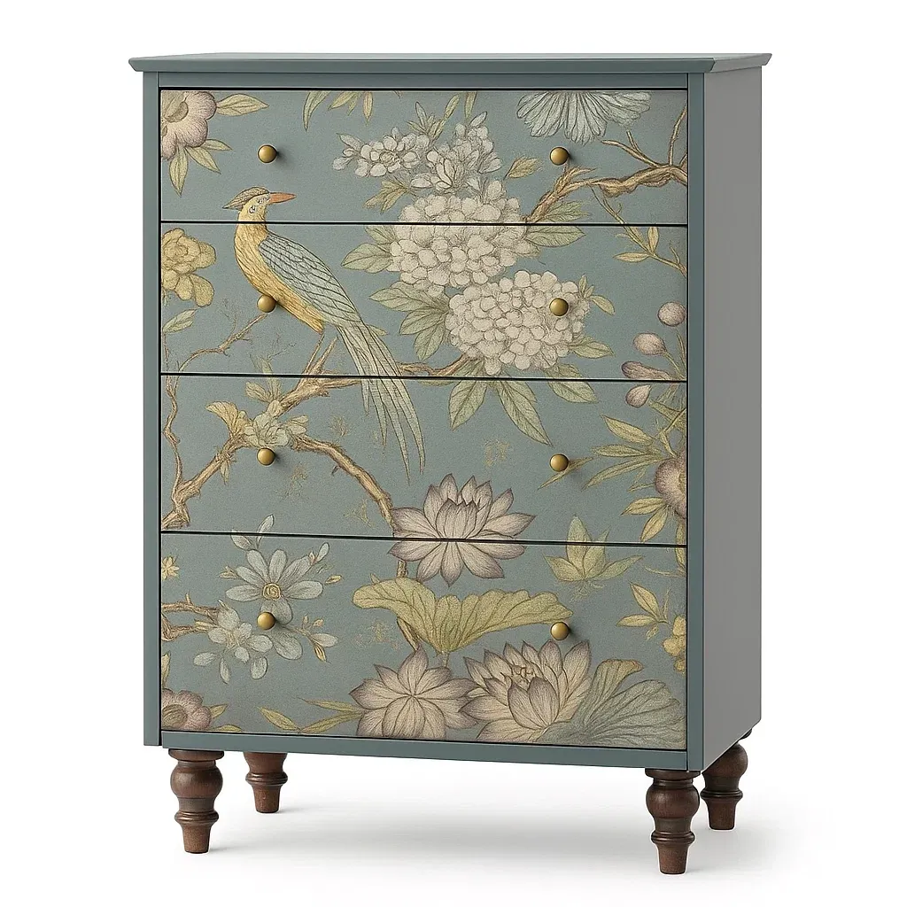 Commode en MDF avec motif floral et oiseaux, finition en peinture lisse.