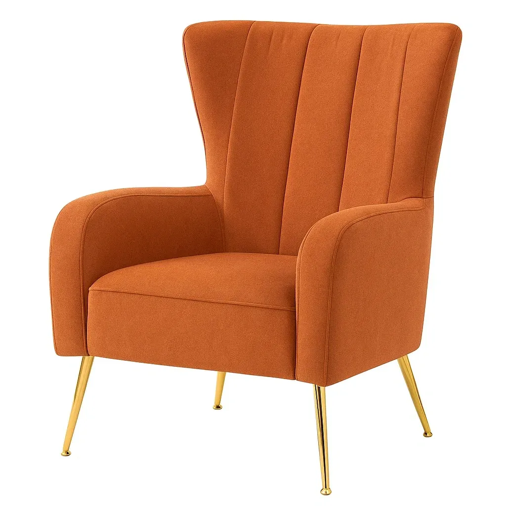 Fauteuil en tissu polyester orange avec pieds en métal doré