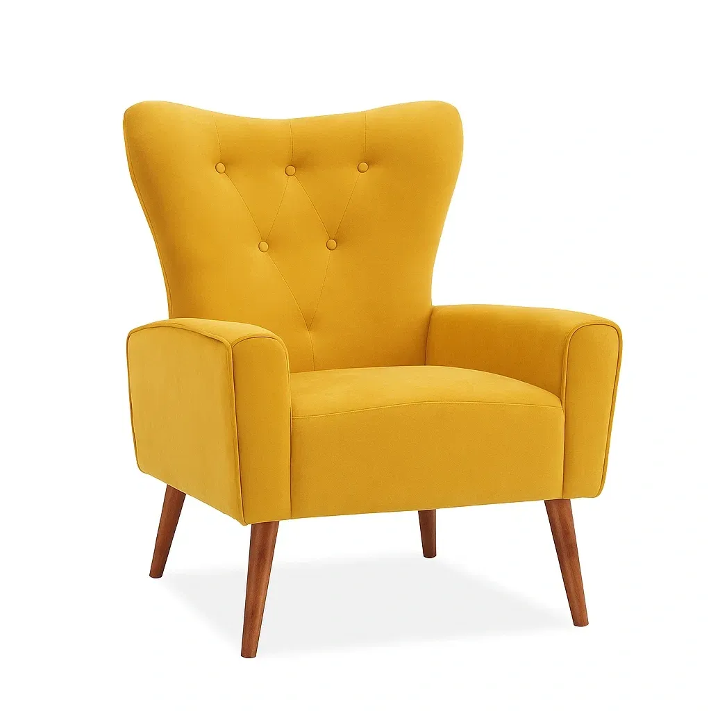 Fauteuil en tissu velours jaune avec pieds en bois