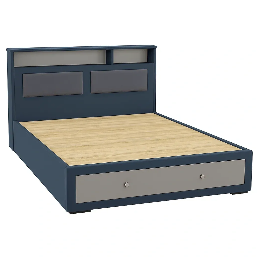 Lit en bois, tissu polyester avec tête de lit rembourrée et rangement 200x140x95 cm