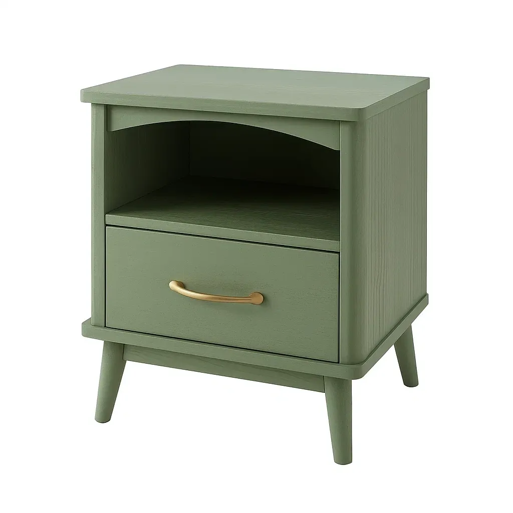 Elle dispose d'un tiroir avec une poignée en métal doré et d'une étagère ouverte.